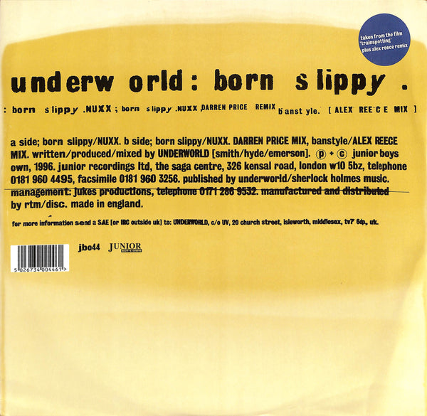 ARTIST: UnderworldTITLE: Born SlippyLABEL: Junior Boy's OwnCAT: jbo44TYPE: VinylFORMAT: VinylCOUNTRY: UKRELEASED: 1996-07-01GENRE: ElectronicSTYLES: Techno, Drum n BassWEIGHT: 180g