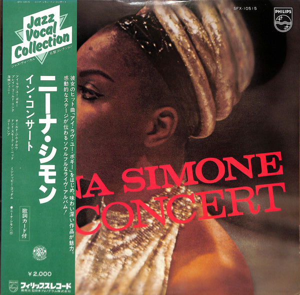 ARTIST: Nina SimoneTITLE: In ConcertLABEL: PhilipsCAT: SFX-10515TYPE: VinylFORMAT: VinylCOUNTRY: JapanRELEASED: 1977GENRE: JazzSTYLES: Soul-JazzWEIGHT: 290g